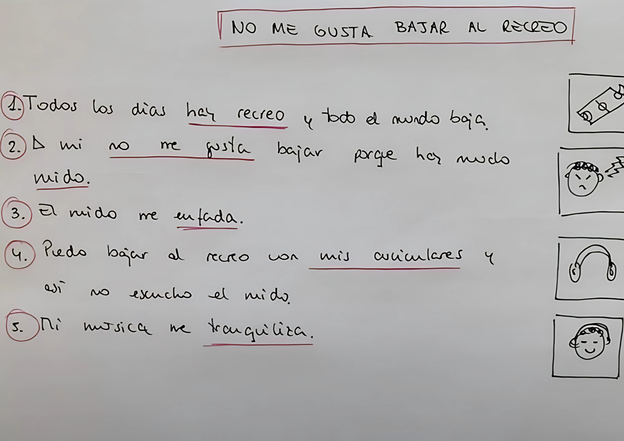 Finalmente, se ofrece una alternativa a la conducta problemática. En nuestro ejemplo, podría ser: “Puedo tomar mis audífonos y bajar al recreo, poniendo música tranquila. Así no escucho el ruido y puedo estar con mis compañeros”.